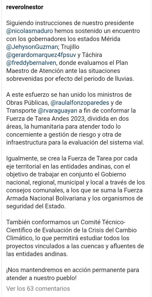 Así lo dio a conocer a través de sus redes sociales, y destacó que los gobernadores, Jehyson Guzmán, Freddy Bernal y Gerardo Márquez, estuvieron presentes los ministros de Obras Públicas, Raul Paredes y el de Transporte, Ramón Velásquez Araguayan, “con el objetivo de conformar la Fuerza de Tarea Andes 2023, dividida en dos áreas, la humanitaria para atender todo lo concerniente a gestión de riesgo y otra de infraestructura para la evaluación del sistema vial”, indicó Reverol.