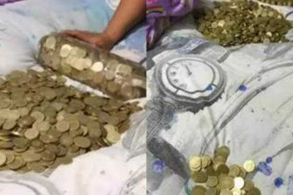 En un primer video mostró que llenó dos botellas completas y que otra la dejó a la mitad. Desocupó los recipientes encima de su cama y comenzó a contar el dinero que logró recoger.