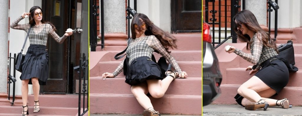La actriz estadounidense y ganadora del Oscar Anne Hathaway, de 42 años, fue vista cayend0 por unas escaleras mientras rodaba una escena de El Diablo Viste a la Moda 2 durante este miércoles 27 de agosto en la ciudad de Nueva York.