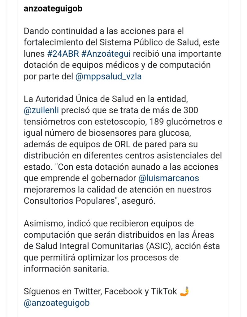 La información fue reseñada a través de la cuenta en la red social de Instagram de la gobernación de Anzoátegui y suministrada por la autoridad única de salud en la entidad, Zuilen Li Moreno, quien precisó que, “con esta dotación mejoraremos la calidad de atención en nuestros consultorios populares”.