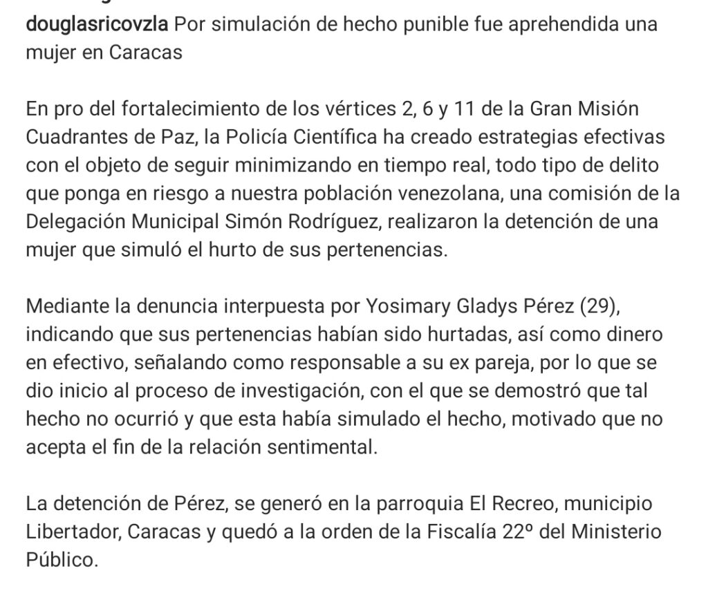 Es importante destacar, que la detención de Pérez, se generó en la parroquia El Recreo, municipio Libertador, Caracas y quedó a la orden de la Fiscalía 22º del Ministerio Público.