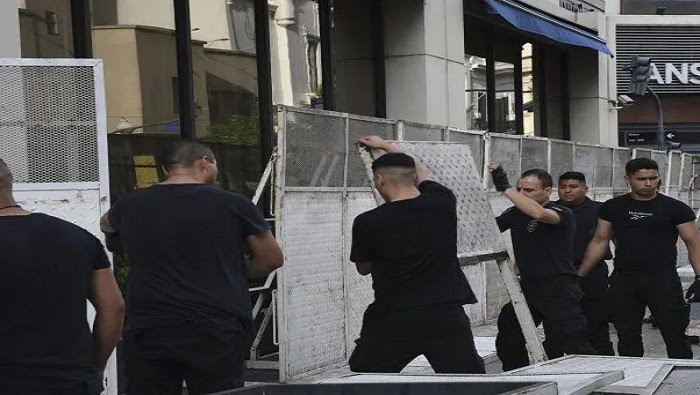 Por su parte, las autoridades argentinas han colocado vallas alrededor del Hotel Libertador. A partir de la orden del presidente Milei, en el país rige un duro protocolo «antipiquetes», que no solo impide los cortes de la vía pública, sino que cobra a las organizaciones sociales por los despliegues policiales que acordonan las protestas.