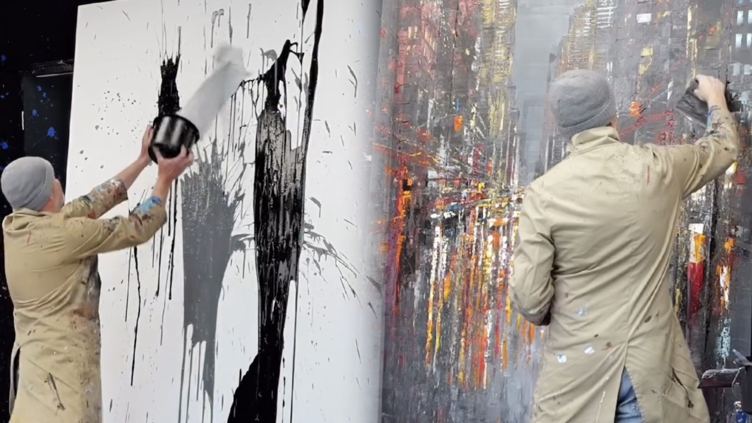 En las imágenes, el creador comienza a salpicar pintura de distintos colores directamente sobre el lienzo, mientras utiliza una paleta y otros recursos manuales para ir guiando las formas que previamente tiene en su mente, construyendo la composición paso a paso.