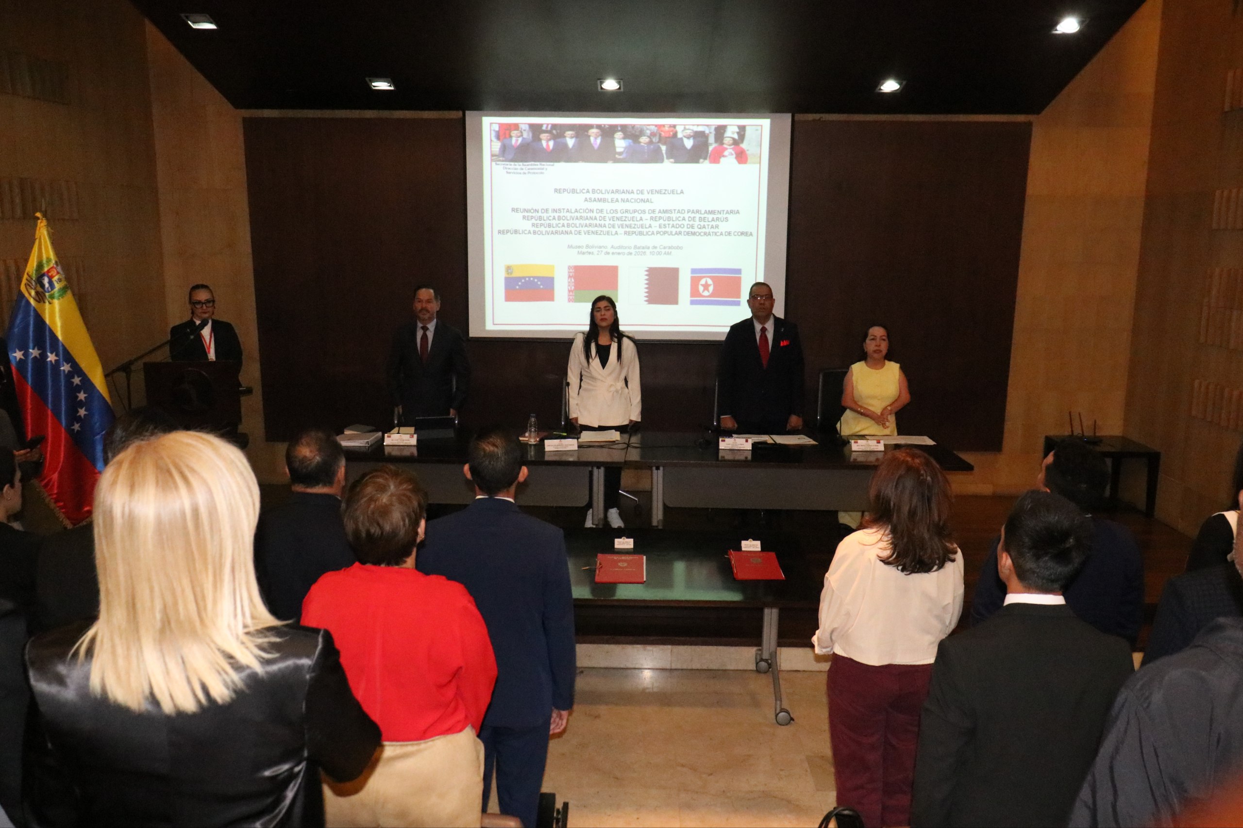 La Asamblea Nacional de Venezuela formalizó este martes 27 de enero la instalación de los Grupos de Amistad Parlamentaria con la República de Belarús, el Estado de Qatar y la República Popular Democrática de Corea. El evento, realizado en el auditorio Bätalla de Carabobo del Museo Boliviano, estuvo presidido por la segunda vicepresidenta del legislativo, diputada Grecia Colmenares, y contó con la presencia de diversos parlamentarios y representantes del cuerpo diplomático acreditados en el país.