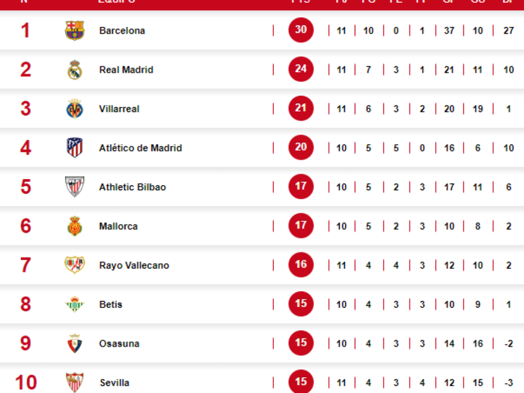 Le sigue el Rayo Vallecano con 16 puntos, Betis, Osasuna y Sevilla completan los primeros 10 lugares con 15 puntos en su cuenta en la Liga Española.
