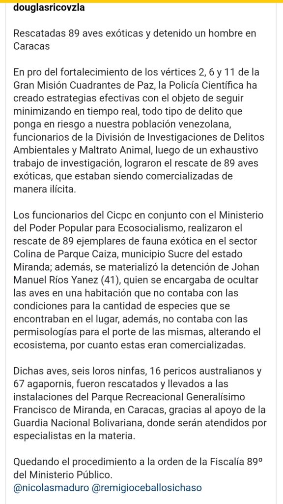 Los funcionarios del Cuerpo de Investigaciones Científicas, Penales y Criminalísticas (Cicpc), en conjunto con el Ministerio de Ecosocialismo, realizaron el rescate de 89 ejemplares de fauna exótica en el sector Colina de Parque Caiza, municipio Sucre del estado Miranda; además, se materializó la detención de Johan Manuel Ríos Yanez (41), quien se encargaba de ocultar las aves en una habitación que no contaba con las condiciones para la cantidad de especies que se encontraban en el lugar, además, no contaba con las permisología para el porte de las mismas, alterando el ecosistema, por cuanto estas eran comercializadas.