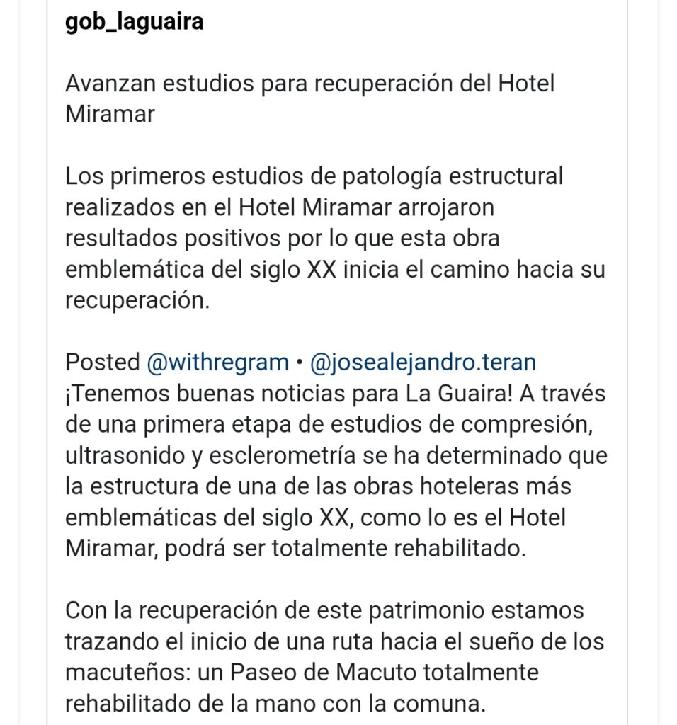 La información fue publicada a través de la red social Instagram @gob_laguaira, donde se detalló que “los primeros estudios de patología estructural realizados en el Hotel Miramar, arrojaron resultados positivos por lo que esta obra emblemática del siglo XX inicia el camino hacia su recuperación”.