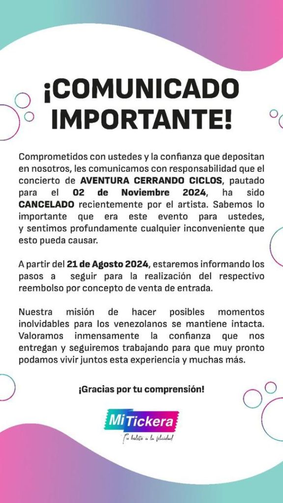Este viernes 16 de agosto en horas de la tarde, la empresa Mi Tickera, emitió un comunicado en el que informaron que el concierto «Aventura Cerrando Ciclos» en el que se presentaría la agrupación junto a Romeo Santos, programado para el próximo 2 de noviembre de 2024, ha sido cancelado por el artista.