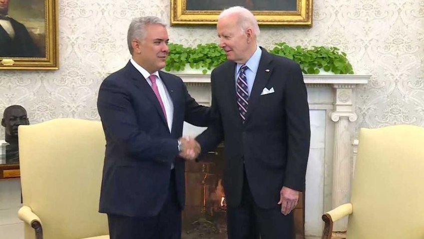 Biden realizó un afectuoso saludo al Jefe de Estado colombiano, quien se convierte en el primer mandatario de América Latina en ser recibido por el presidente de Estados Unidos en la Casa Blanca, encuentro que consolida la relación diplomática entre ambos países, que cumple 200 años de historia.