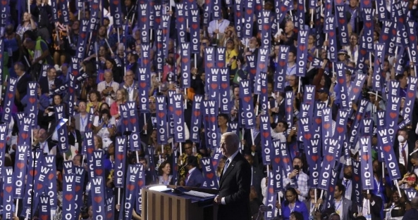 El discurso de Biden comenzó, sin embargo, con un tono positivo. Fue recibido por los asistentes a la Convención Nacional Demócrata en Chicago con aplausos y gritos de «We love you Joe» (Te queremos Joe) mientras agitaban pancartas azules con el mismo mensaje y corazones rojos.