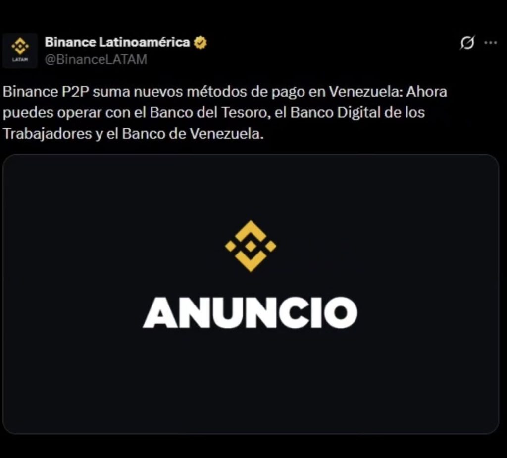 La plataforma global de intercambio de criptoactivos, Binänce, anunció este miércoles la incorporación formal de tres de las principales entidades financieras del Estado venezolano como métodos de pago directos en su plataforma *Peer-to-Peer* (P2P).