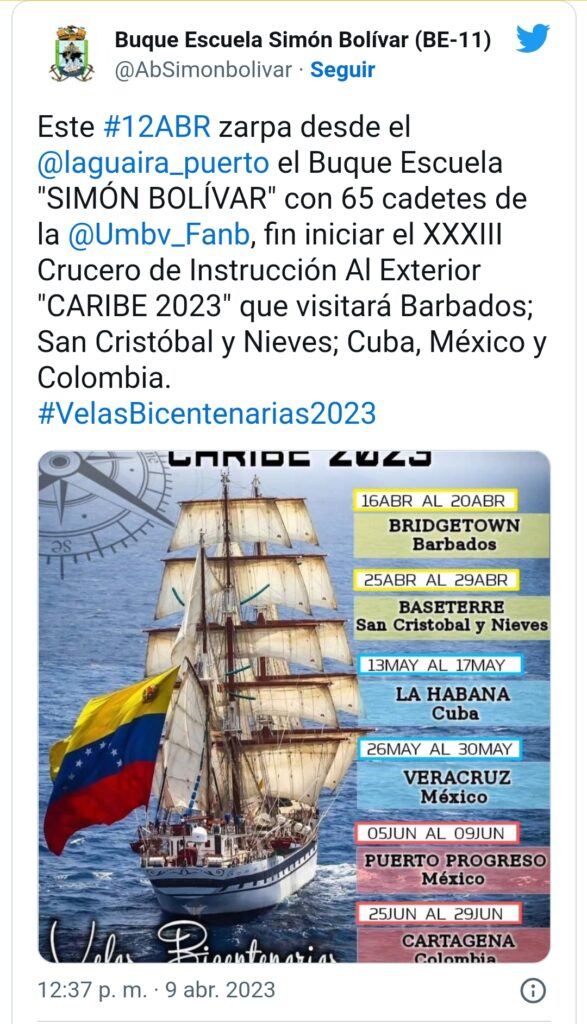 El próximo miércoles 12 de abril, el Buque Escuela Simón Bolívar partirá en horas de la mañana desde el Puerto de La Guaira, en la entidad costera.