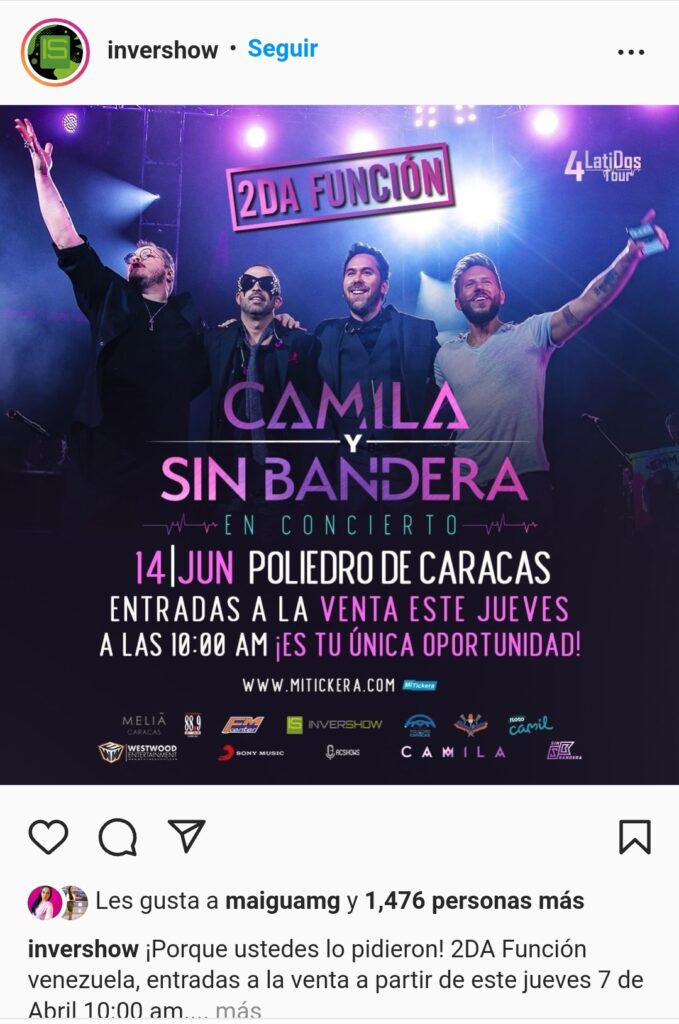 El dúo Sin Bandera, por su parte, también postearon el anuncio en sus redes sociales acompañado del mensaje: «¡Caracas! ¿Se quedaron sin boleto? 🇻🇪 Nueva función a la venta mañana.
