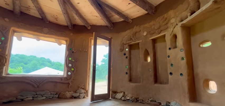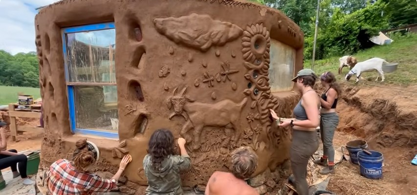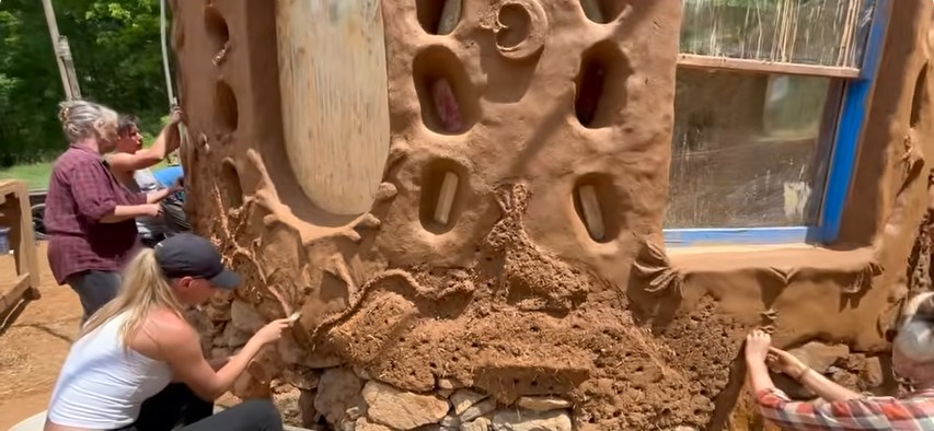 Es en este momento que la casa de barro, construida desde cero, comienza a tomar la apariencia de una vivienda habitable, con aberturas definidas y circulaciones claras. Tras la estructura tosca, llega la parte más artística. Utilizando prácticamente la misma mezcla de arcilla, arena y paja, pero más refinada, el grupo crea volúmenes esculpidos en la superficie de los muros.