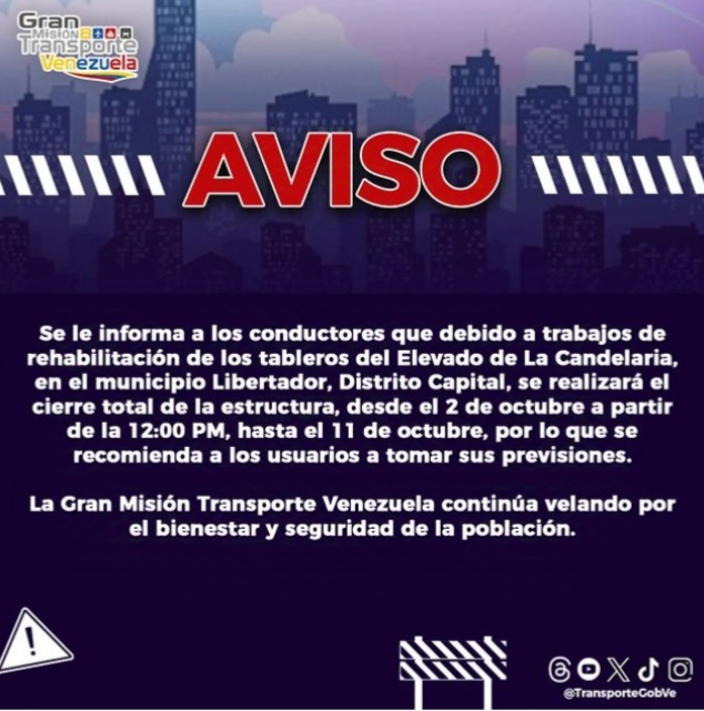 El Ministerio para el Transporte informó que el elevado de La Candelaria, en Caracas, estará cerrado totalmente por trabajos de mantenimiento desde el 2 hasta el 11 de octubre.