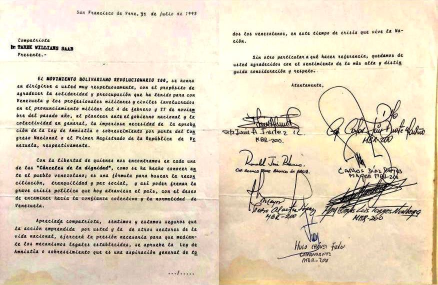 De esa categoría de hombres es Chávez y Tarek …Este honroso documento escrito por los Rebeldes del 4 de Febrero del 27 de noviembre, como carta a Tarek desde la Cárcel de Yare, es una prueba más que se acumula al incesante trajinar del