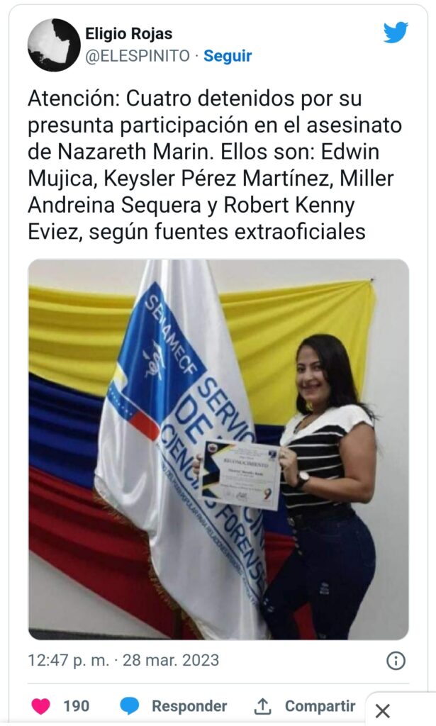 Por su presunta participación en el asesinato de Nazareth Mercedes Marín Placencia (27), trabajadora del Servicio Nacional de Ciencias Forenses (Senamef), agentes del Cicpc detuvieron a cuatro personas, según fuentes judiciales.