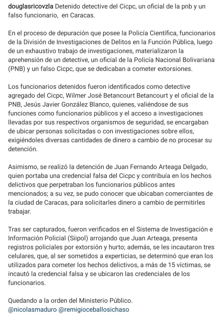 El director del Cuerpo de Investigaciones Científicas, Penales y Criminalísticas, Douglas Rico, informó a través de la red social Instagram la detención de un detective del Cicpc, un oficial de la Policía Nacional Bolivariana y un civil por casos de extorsión.