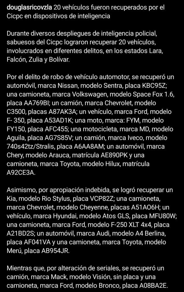 Según la información compartida por Rico en redes sociales, los vehículos estaban involucrados en diferentes delitos, en los estados Lara, Falcón, Zulia y Bolívar.