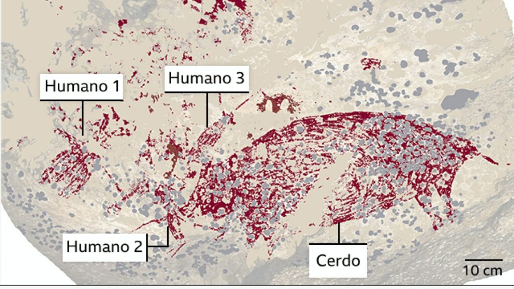 La pintura de un cerdo salvaje y tres figuras humanas tiene al menos 51 mil 200 años, unos cinco mil años más que el arte rupestre más antiguo descubierto anteriormente.