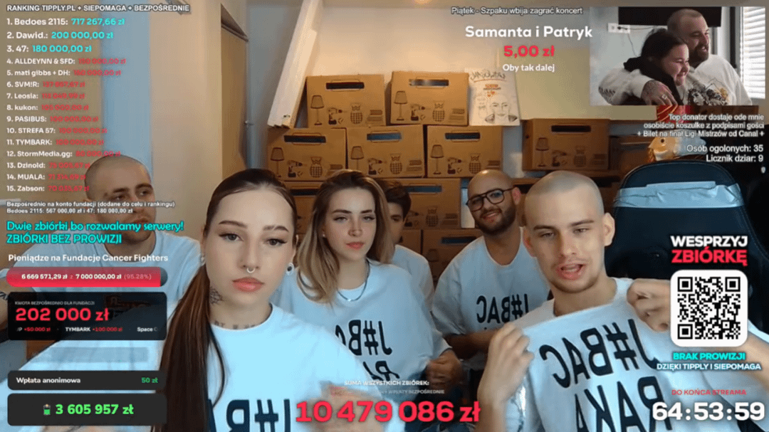 Una campaña benéfica polaca online pasará a la historia de las recaudaciones benéficas mundiales. Organizada por el influencer Patryk Garkowski, conocido como Łatwogang, la retransmisión en directo a través de YouTube durante nueve días acabó batiendo el récord Guinness a la mayor cantidad recaudada durante una sola emisión en directo.