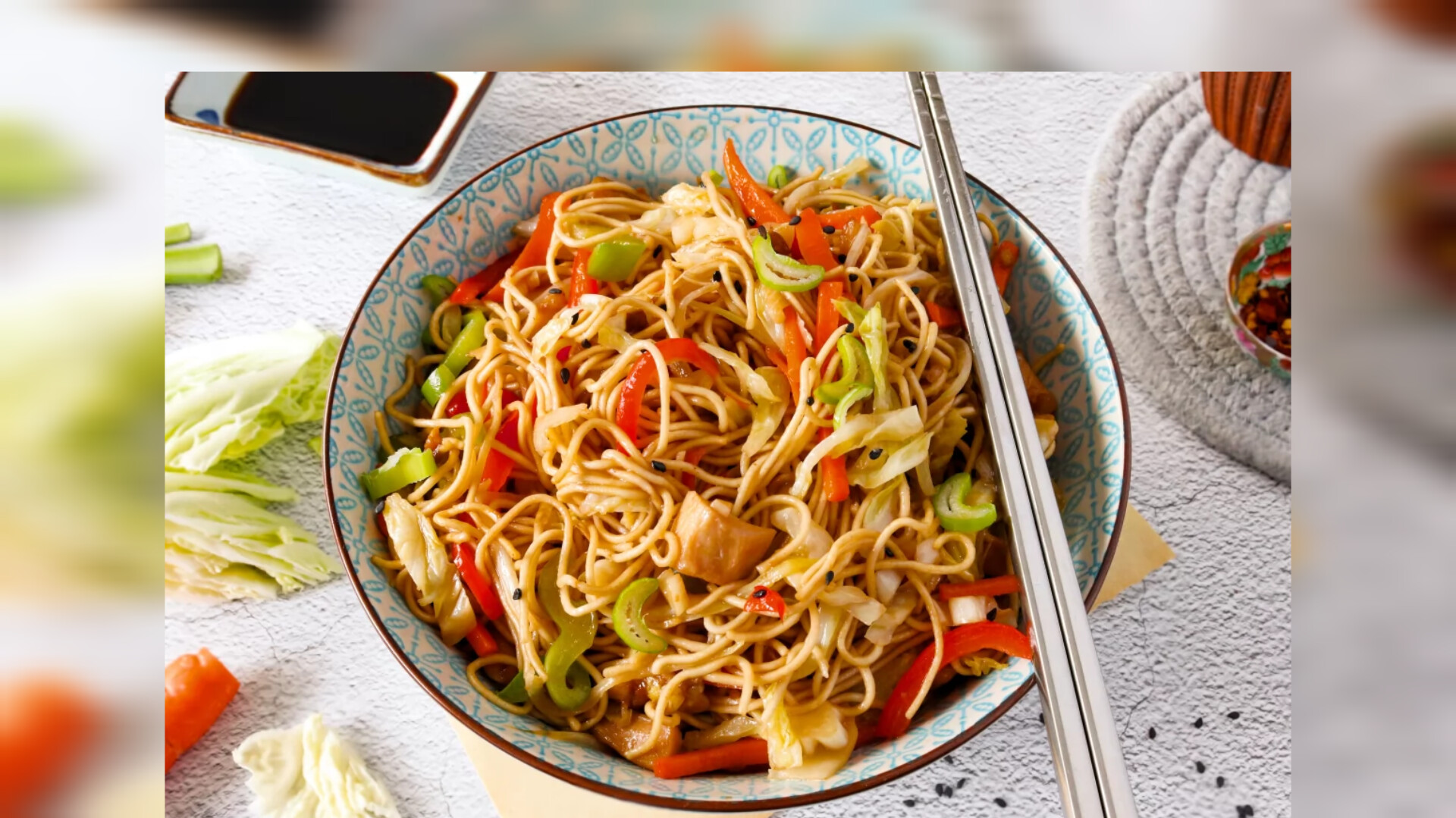 El chow mein es un plato chino muy popular que consiste en fideos salteados (“fideos fritos”). Este tiene pollo, verduras variadas y una salsa sabrosa. Aunque normalmente se hace en wok, también se puede preparar con una sartén grande. Tiempo total: unos 35 minutos para 2 personas.