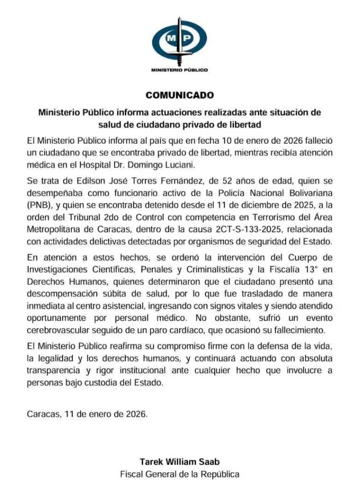 El Ministerio Público de la República Bolivariana de Venezuela informa a la opinión pública sobre el sensible fallëcimiento del ciudadano Edilson José Torres Fernández, de 52 años de edad, ocurrido el pasado 10 de enero de 2026, mientras recibía atención médica especializada.