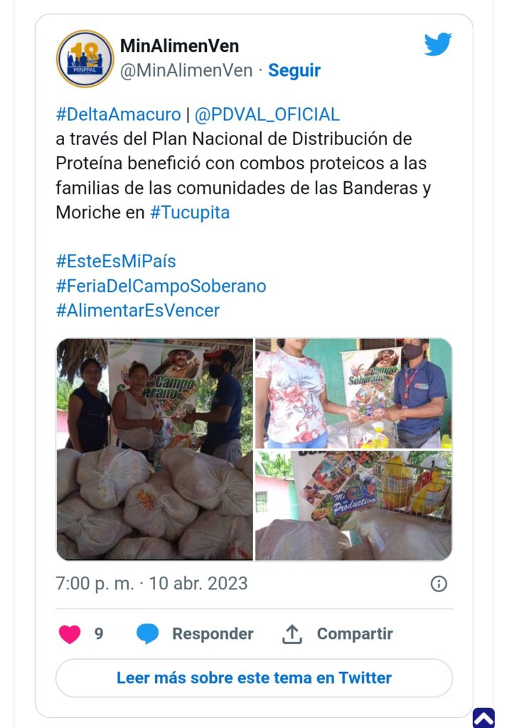 Familias pertenecientes a las comunidades de las Banderas y Moriche en Tucupita, estado Delta Amacuro, recibieron combos proteicos a través de la Feria del Campo soberano, desplegada como parte del Plan Nacional de Distribución de Proteína, para asegurar el acceso a los alimentos de primera necesidad al pueblo venezolano.