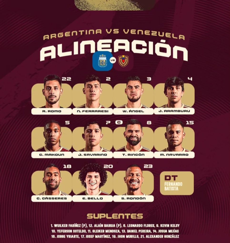 En este contexto ya se conocen los nombres de los 11 jugadores que saldrán por el equipo venezolano a medirse contra Argentina en Buenos Aires, en el estadio Monumental de River Plate.