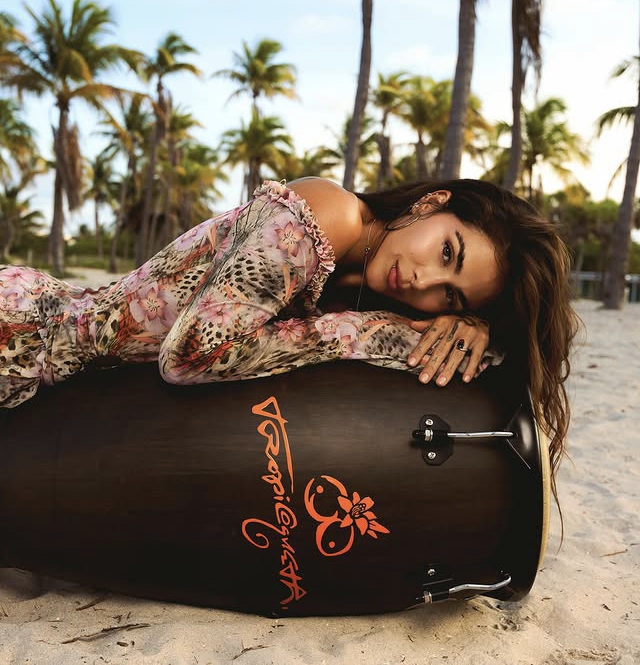 El momento fue compartido por Greeicy en sus historias de Instagram, donde se ve abriendo el enorme paquete desde la playa, emocionada por lo que encuentra dentro. Apenas revelado el instrumento, la cantante no dudó en improvisar una sesión de fotos frente al mar, con el tambor como protagonista.