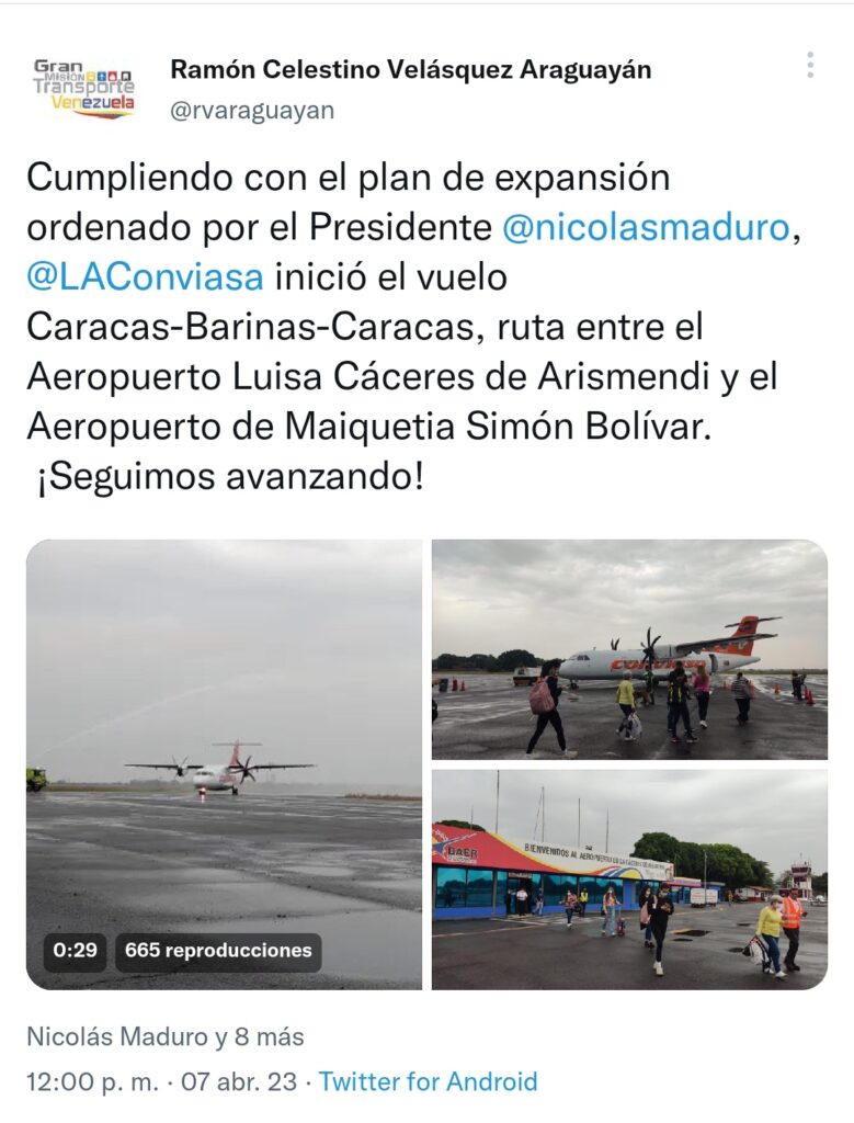 “Cumpliendo con el plan de expansión ordenado por el presidente de la República Bolivariana de Venezuela, Nicolás Maduro, Conviasa inició el vuelo Caracas-Barinas-Caracas, ruta entre el Aeropuerto Luisa Cáceres de Arismendi y el Aeropuerto de Maiquetía Simón Bolívar”, en La Guaira, afirmó Velásquez en su cuenta de la red social Twitter.
