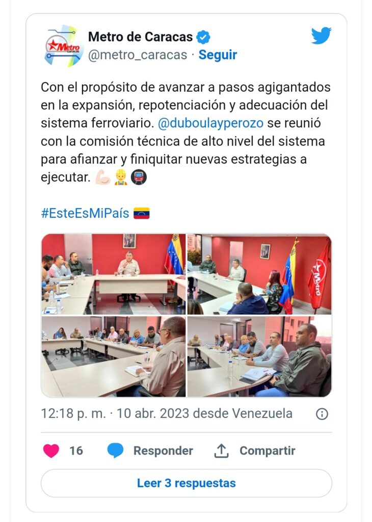 “Con el propósito de avanzar a pasos agigantados en la expansión, repotenciación y adecuación del sistema ferroviario, sostuvimos un encuentro con la Comisión Técnica de Alto Nivel para afianzar y finiquitar nuevas estrategias”, así lo anunció el presidente del Metro de Caracas, M/G Juan Carlos Du Bolay Perozo, a través de una publicación en la red social Twitter @metro_caracas.