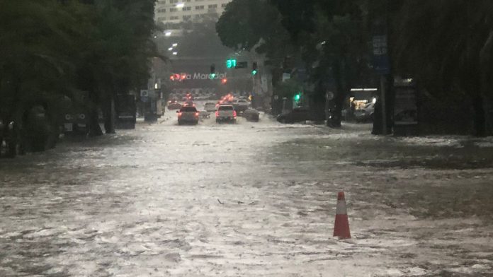 Las fuertes precipitaciones vinieron acompañadas de vientos y una tormenta eléctrica que causaron estragos en distintas zonas de la ciudad capital. La Candelaria, Altamira, la parroquia San Pedro, El Paraíso, Las Mercedes, Los Ruices son algunas de las vías que quedaron inundadas.