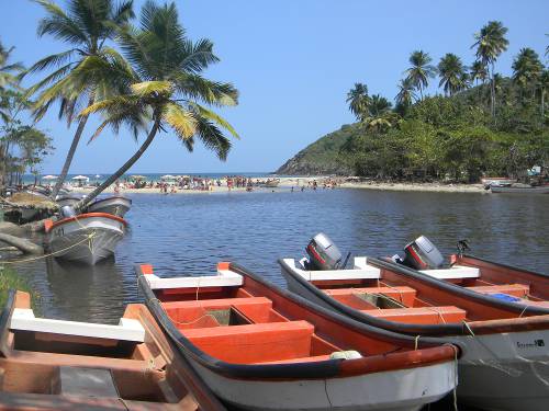La playa de Cuyagua se encuentra a un par de kilómetros del pueblo. Se le llega bordeando el río Cuyagua, en donde hay muchos lugares para acampar y en donde muchos vehículos tienen carpas en su techo. Al final del camino, se encuentra la boca que comunica el río con el mar, en donde verás varias decenas de botes pesqueros. Los cocoteros de la playa permiten que se pueda acampar en carpas. También hay un restaurant con servicio de toldos y comida. No deje de probar el plato especial de pescado.