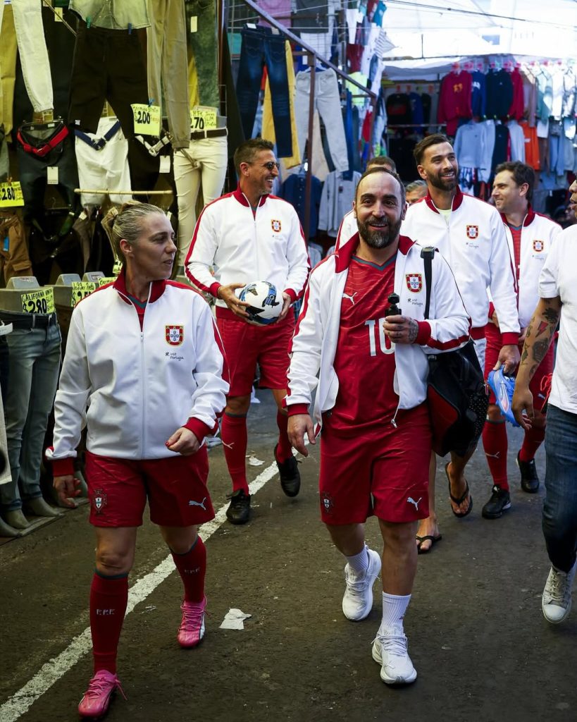 El punto culminante de este encuentro transatlántico ocurrió en el icónico «Campo del Maracaná», la cancha de fútbol más famosa de Tepito y semillero de talentos locales. Allí, las leyendas portuguesas no dudaron en saltar al terreno de juego para participar en una tradicional «cascarita» (un partido amistoso y espontáneo) con los jóvenes y deportistas de la comunidad.