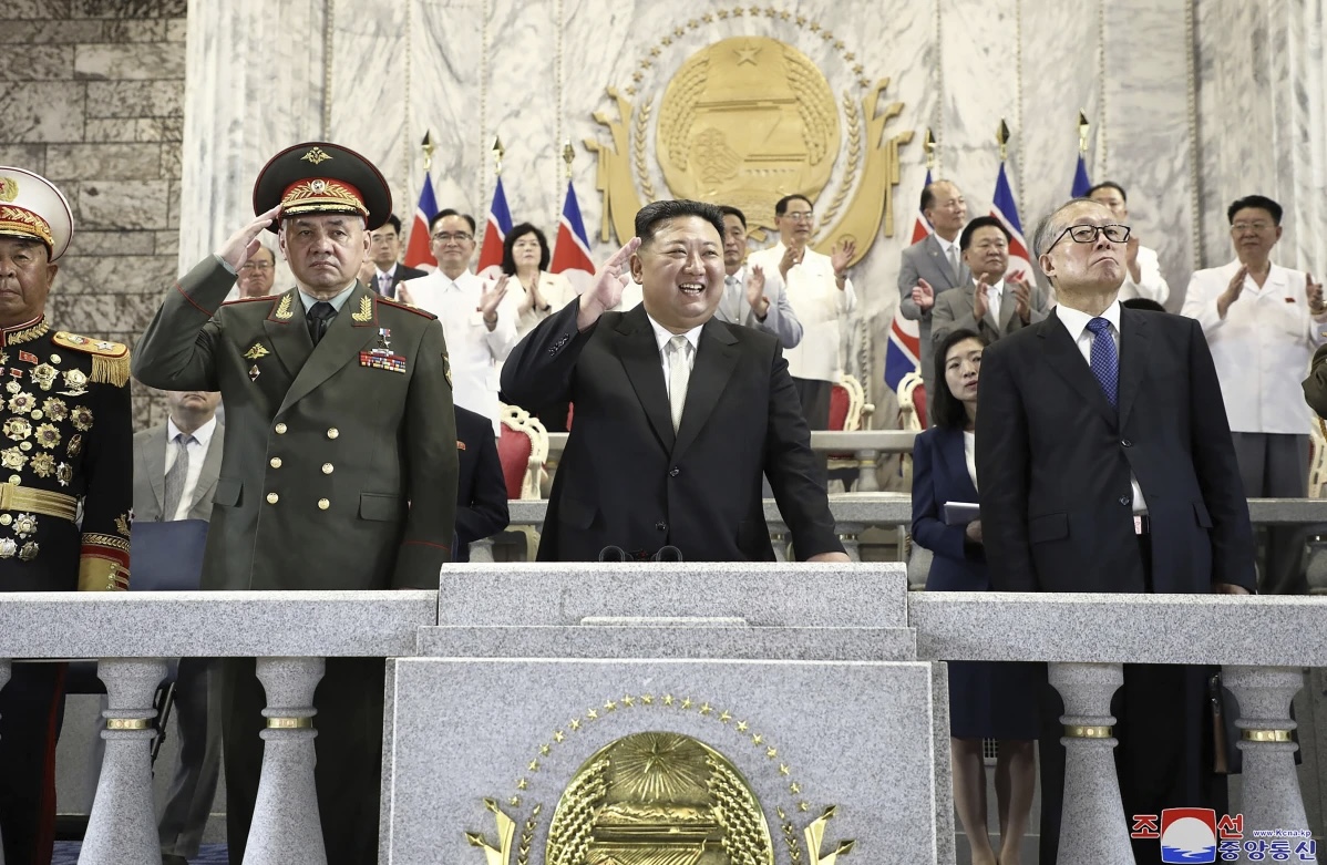Kim presenció el acto del jueves por la noche junto al ministro ruso de Defensa, Serguéi Shoigu, y a un funcionario del partido gobernante chino, Li Hongzhong, desde un balcón que da a la plaza Kim Il Sung, que lleva el nombre del fundador de Corea del Norte, el abuelo del mandatario actual.
