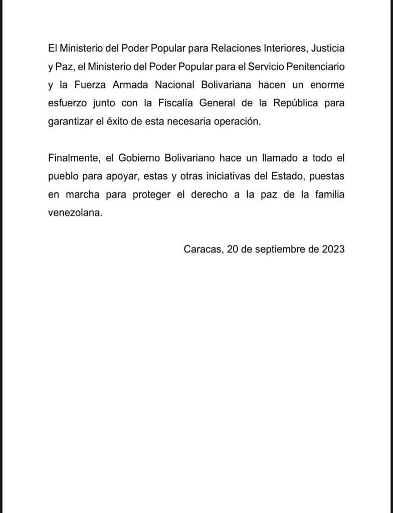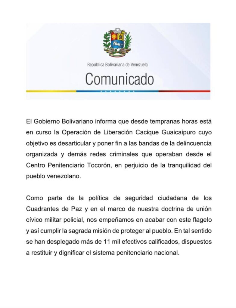 El Gobierno Bolivariano a través de un comunicado del Ministerio del Poder Popular para Relaciones Interiores, Justicia y Paz en la red social X (Twitter), informó sobre el despliegue de la Operación Liberación Cacique Guaicaipuro para desarticular bandas delincuenciales en el Centro Penitenciario de Tocorón, en el estado Aragua, en la que participan 11 mil efectivos calificados de los órganos de seguridad ciudadana y de la Fuerza Armada Nacional Bolivariana (FANB).