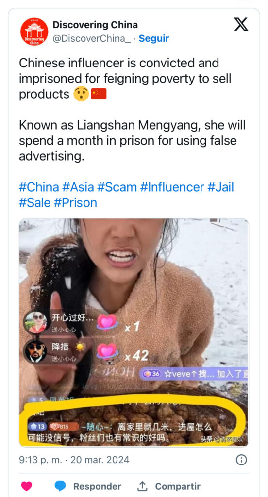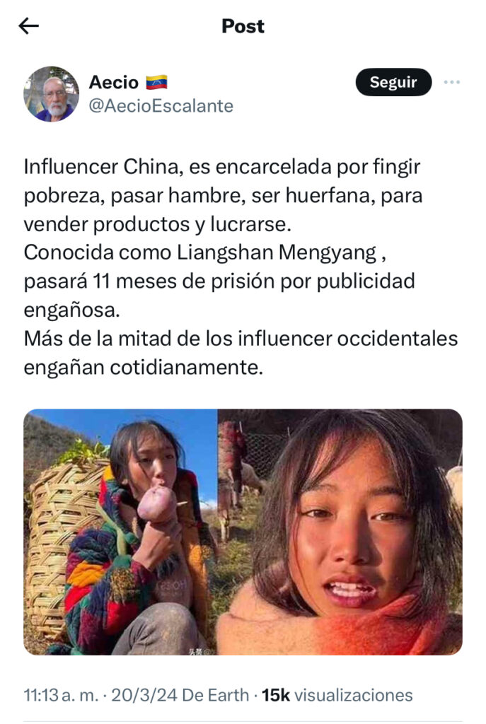 El fraude se descubrió después de que internautas expresaran sus dudas sobre la historia de una «influencer» conocida como «Liangshan Mengyang», quien llegó a acumular casi cuatro millones de seguidores fingiendo que vivía en una región empobrecida en las montañas Liangshan de Sichuan, donde decía que había criado ella misma a sus hermanos tras quedarse huérfanos.