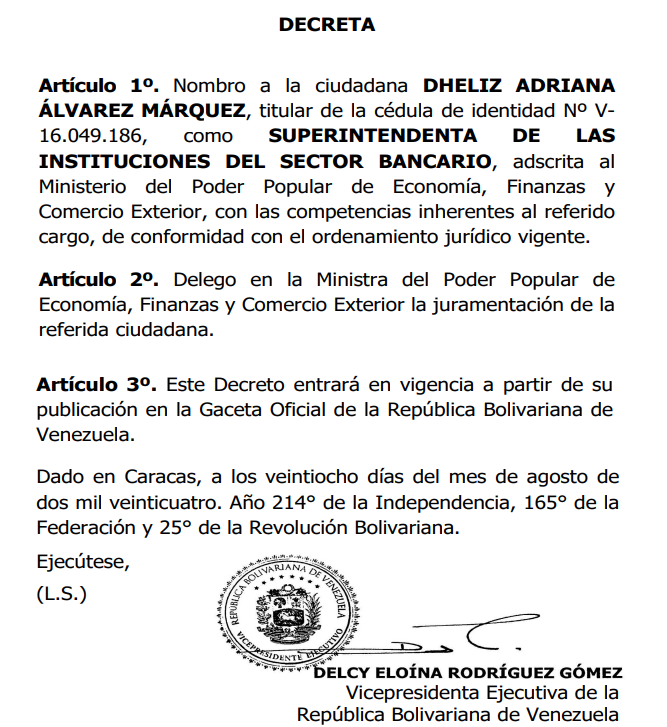 Dheliz Álvarez fue designada como la nueva superintendente de la Superintendencia Nacional de Instituciones del Sector Bancario (Sudeban), de acuerdo a Gaceta Oficial Extraordinaria número 6.831, como parte de la reestructuración del gabinete Ejecutivo que realiza el presiente Nicolás Maduro.