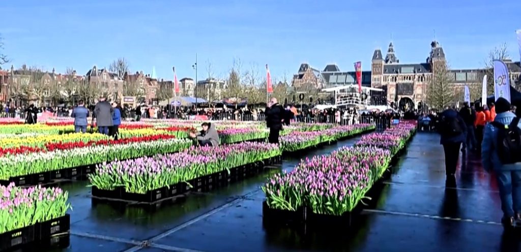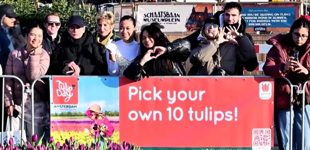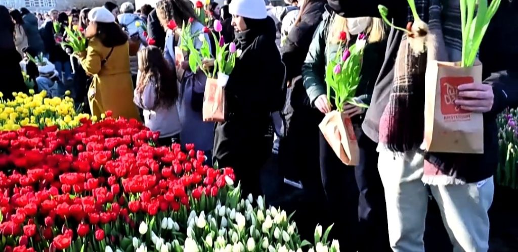 Museumplein de Ámsterdam repartió 200.000 tulipanes gratis por el Día Nacional del Tulipán de los Países Bajos, inicio de la temporada internacional de tulipanes cortados.