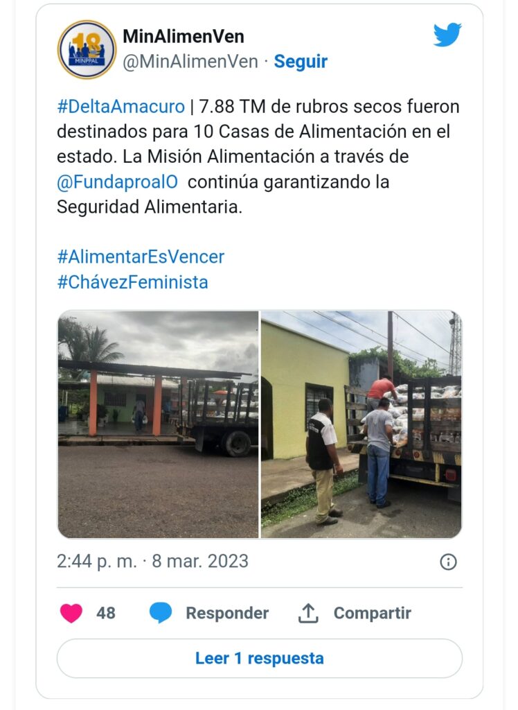 Un total de 7.88 toneladas de rubros alimenticios fueron destinados para 10 Casas de Alimentación en el estado Delta Amacuro, a fin de continuar garantizando la seguridad alimentaria en dicha entidad territorial.