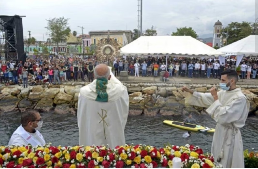 La misa denominada eucaristía de pascuas y resurrección contó con la presencia de monseñor Saúl Figueroa, quien ofició la misa desde una gabarra, acompañado por varios sacerdotes.