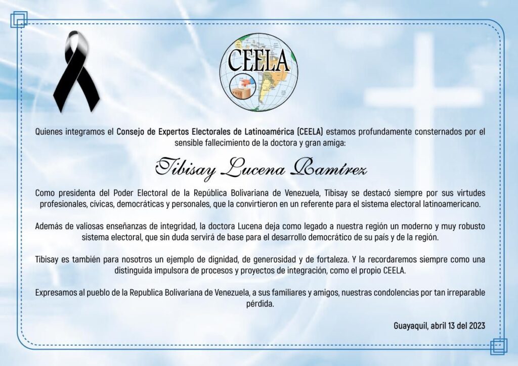 El Consejo de Expertos Electorales de Latinoamérica (Ceela), lamentó profundamente el fallecimiento de la ministra de Educación Universitaria, Tibisay Lucena, quien además durante 14 años dirigió el Consejo Nacional Electoral (CNE), destacando la “virtud profesional, cívica, y personal que la convirtieron en referente para el sistema electoral latinoamericano».