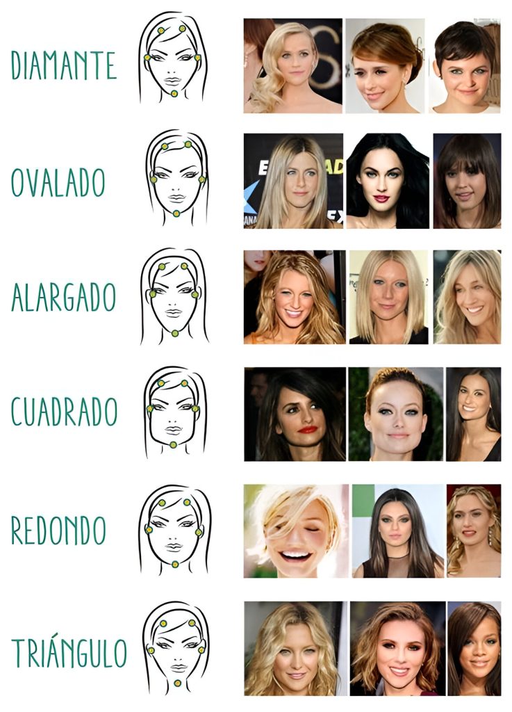 Los rostros con forma de diamante tienen pómulos altos y una frente y mandíbula estrechas. Los cortes que más les favorecen son: Cortes a capas para añadir volumen alrededor de la mandíbula. Rayas laterales para suavizar los ángulos. Estilos a la altura de los hombros para equilibrar la forma del rostro.