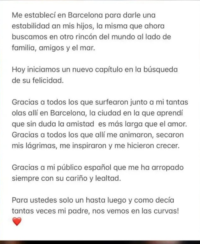 “Me establecí en Barcelona para darle una estabilidad a mis hijos, la misma que ahora buscamos en otro rincón del mundo al lado de familia, amigos y el mar”, escribió Shakira.