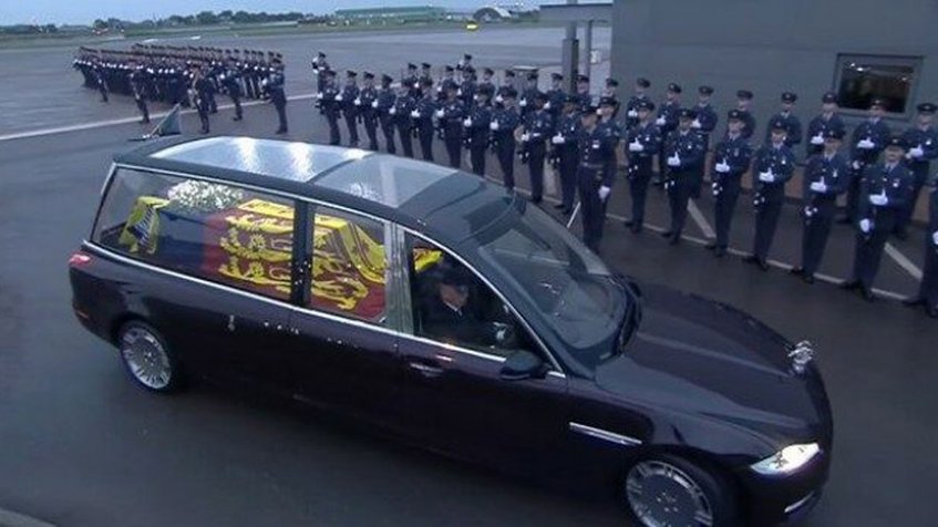 Una aeronave C-17 Globemaster, usada recientemente en misiones de ayuda a Ucrania, se posó en la base militar de Northolt a las 06:54 PM (hora local), transportando en su interior el féretro cubierto con el estandarte real y una corona de flores.