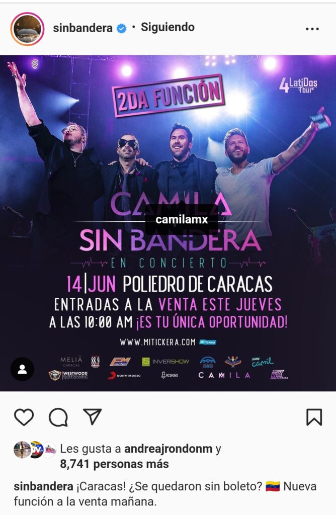 Los dúos Sin Bandera y Camila se presentarán en una nueva fecha en el Poliedro de Caracas luego de agotar la taquilla de la primera presentación.