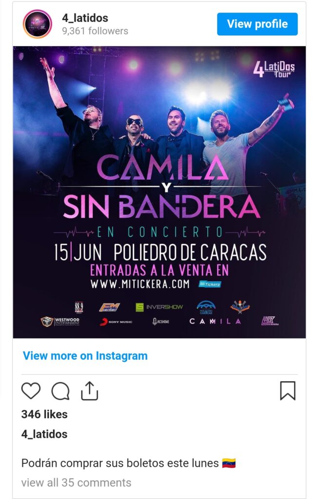 Tras 2 años de inactividad cultural el Poliedro de Caracas abre sus puertas con “4 LatiDos Tour”, este 15 de junio con el encuentro de dos íconos de la música en español, Sin Bandera y Camila, mediante su cuenta oficial de Instagram el grupo mexicano confirmó la noticia para el público venezolano.