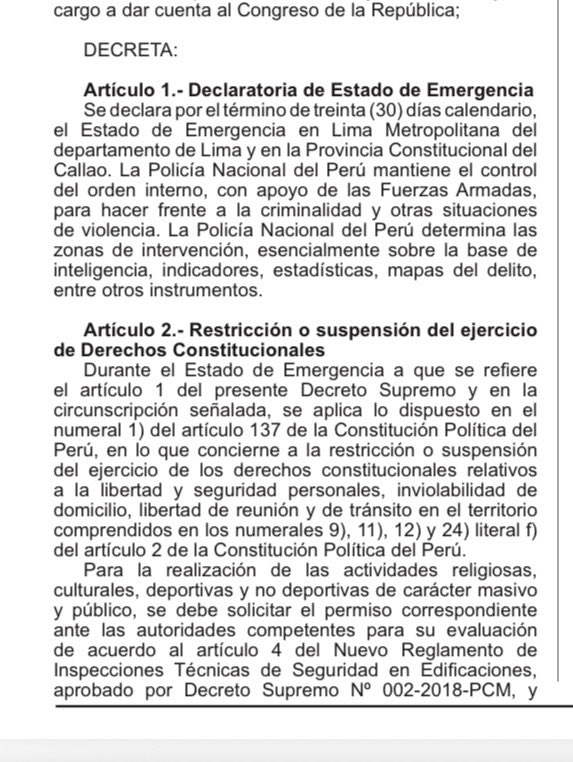 «Hoy empezamos a cambiar la historia en la lucha contra la inseguridad en el Perú», manifestó el mandatario en un mensaje a la Nación, explicando que la medida «presenta un nuevo enfoque: pasamos de la defensiva a la ofensivÄ en la lucha contra el crimËn» que confió permitirá al Gobierno «recuperar la paz, la tranquilidad y la confianza» de la población.