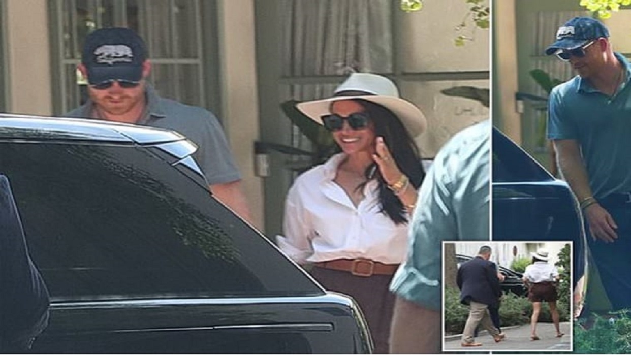 Los duques de Sussex fueron fotografiados, tomados de la mano y muy sonriente mientras caminaba acompañada de un miembro de su equipo de seguridad, que no se separó de ellos en ningún momento, mientras salían de un edificio en Santa Bárbara, California .